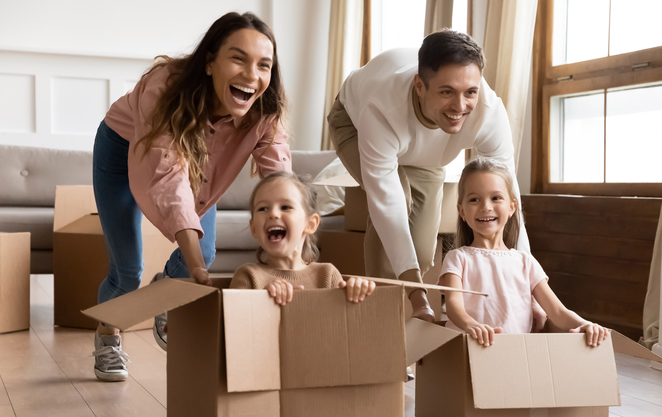 Ein Mädchen läuft mit ausgebreiteten Armen in ein Haus, in dem Umzugskartons stehen, während im Hintergrund die Eltern Kartons ins Haus tragen.